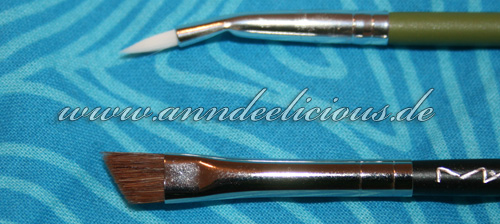 Man muss nicht genau hinsehen, um die Unterschiede zu erkennen: Der alverde-Pinsel hat eine sehr dünne, feine Spitze, die zudem gebogen ist. Der MAC-Pinsel ist ebenfalls sehr schmal, aber dafür in die andere Richtung deutlich breiter und abgeschrägt.
