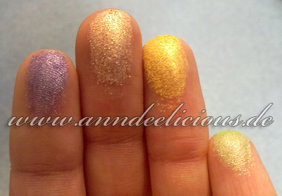 Die Farben sind alle recht hübsch, wie ich finde. Die Farbabgabe schien mir auf den ersten Blick auch sehr gut. Allerdings glaube ich, dass mir das lila nicht sonderlich stehen würde. Grün und gelb fand ich zu grell. Und gold. Nun ja, goldene Lidschatten habe ich zuhauf.
